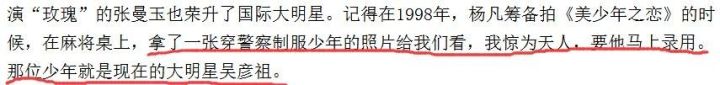 09年,曾为影片担任旁白的林青霞,也在专栏中提过那一幕,“在麻将桌上,拿了一张穿警察制服少年的照片给我们看,我惊为天人,要他马上录用。那位少年就是现在的大明星吴彦祖。”
