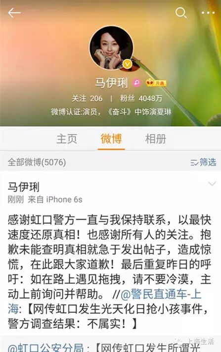 在虹口警方发布辟谣贴之后,今晚20点15分左右,马伊琍发布了一条最新微博向公众道歉: