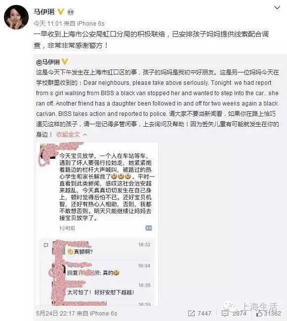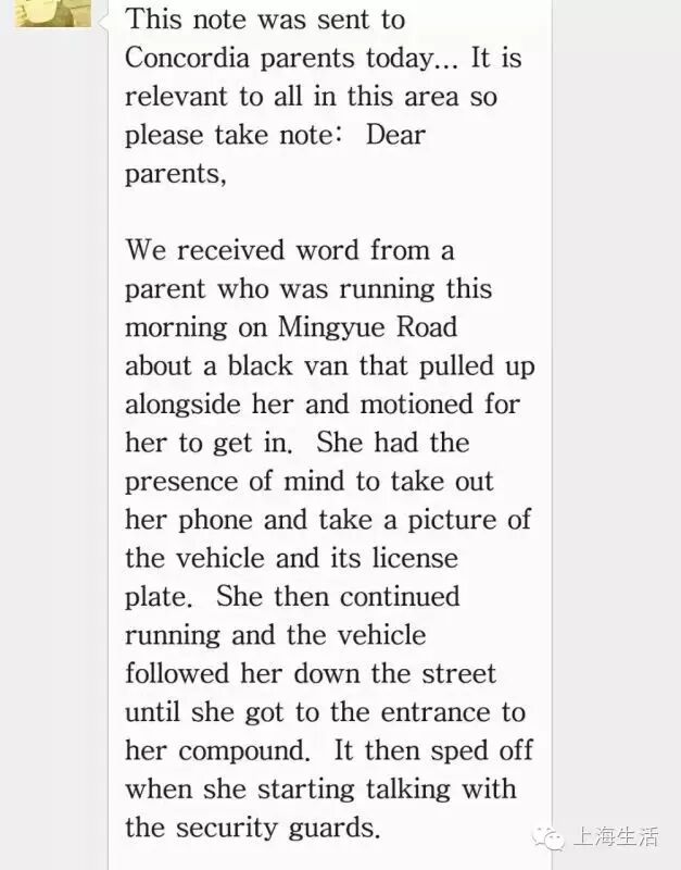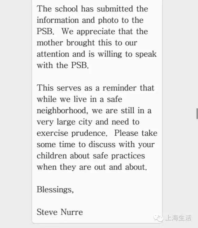 对于网传的学校发出的英文信,经上海市公安局调查,涉及两所上海的民办学校,分别位于浦东和闵行。这部分英文内容是浦东一所学校发的提示信息,但其中拐骗儿童的内容是后期经过别人篡改的。