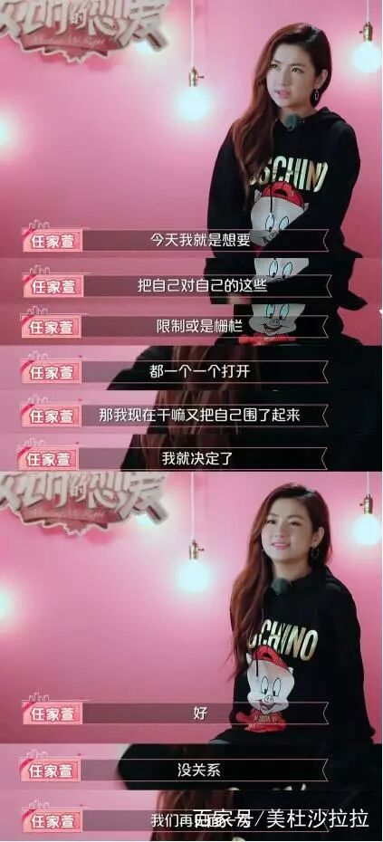 从上一段失败的婚姻走出来的任家萱(英文名:Selina),对自己未来的感情变得期待又谨慎,此次参加《女儿们的恋爱》,从采访中也能看出来她对爱情还是很有期待的,来参加这样一档恋爱真人秀也是鼓起了勇气。