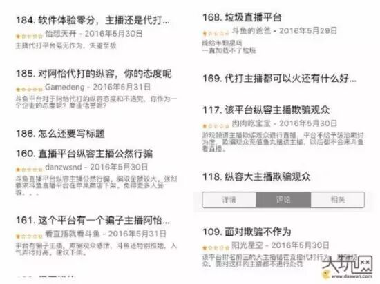 ▲阿怡事件曝光后,斗鱼iOS版客户端由于差评量太大,总体评价率一度下降到了两星半。