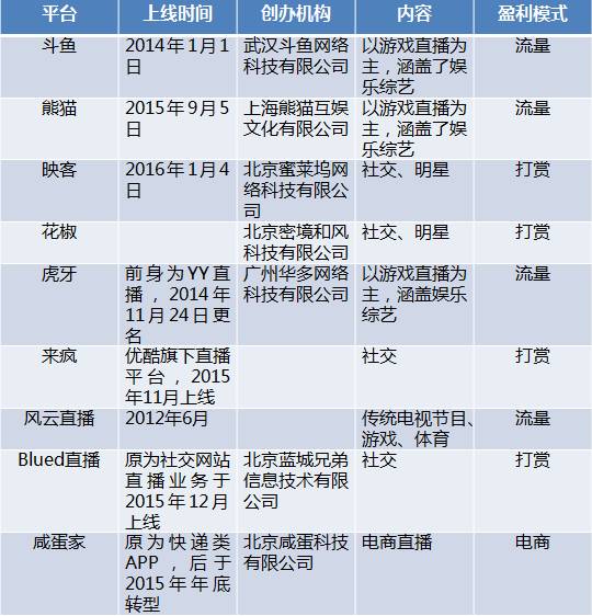 可以看出,目前国内比较火热的几个网络直播平台都是独立运营,并没有挂靠社交平台或视频网站。这些网络直播平台在内容方面主要集中于电竞和社交。