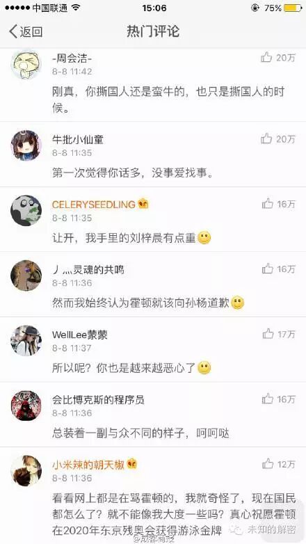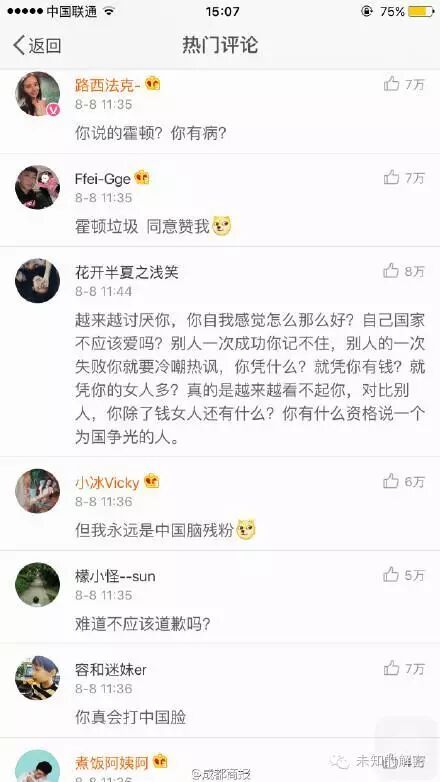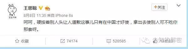 在里约奥运会男子400米自由泳决赛中,霍顿对孙杨的不当言论惹怒国人后,现任国民老公王思聪发表微博称;呵呵 硬按着别人头让别人道歉这事儿只有在中国才好使,拿出去使别人可不吃你那那套呀此文一发王思聪的微博就被网友沦陷,引燃了网友们纷纷的怒火。多数网友们在下边的评论区,表达了自己对王思聪的反感,认为他在讽刺奥运冠军不是一名合格中国人应有的态度