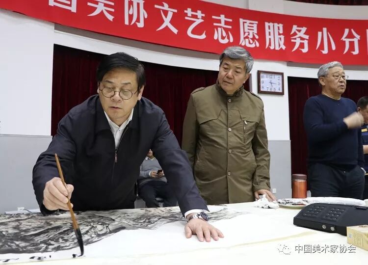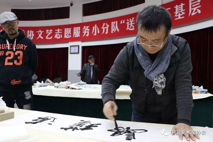 1月9日下午,在己亥春节来临之际,中国美协“送欢乐,下基层”文艺志愿服务小分队专程赶赴北京航天城,开展“我们的中国梦──文化进万家”新春慰问活动。活动由中国美术家协会分党组书记、驻会副主席徐里带队,中国文联国内联络部副主任苗宏、中国美协办公室主任章云、中国文联美术艺术中心活动管理处处长杜松儒、网络信息处副处长杨萍,清华大学美术学院教授陈辉、空军文艺创作室副主任王界山、中国国家博物馆书画院院长刘罡、全国公安文联副主席、全国公安文联美协主席李冬、海军政治部文艺创作室创作员甘长霖、国防大学军事文化学院教授孙浩、国防大学军事文化学院教授任惠中、首都师范大学美术学院副院长王珂、中央美术学院中国画学院党总支书记岳黔山、清华大学美术学院中国画教研室主任韩敬伟、海军政治部文艺创作室一级美术师王伟平、中央美术学院中国画学院教授谢青、中国人民大学艺术学院教授高毅、首都师范大学科德学院环境艺术系主任彭华竞、中国人民大学画院副院长王乘,以及在京部分媒体记者一行30余人参加。