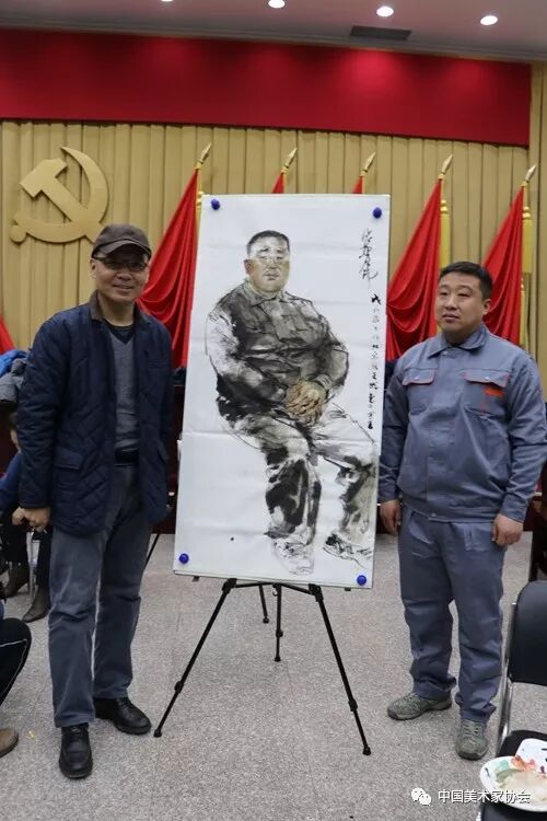 参观结束后,美术家们到会场,徐里、苗宏提笔开始写“春联”、题“福”字,陈辉、王界山、刘罡、韩敬伟、王乘合作山水画《山高水长》;甘长霖、岳黔山、王伟平、谢青合作完成花鸟画《春色满园》;王珂、彭华竞、孙浩为航天员景海鹏、王亚平、陈冬,任惠中、高毅、李冬为航天科技工作者刘勇、李海涛、张晋炜画肖像并赠送本人。这六位航天英模代表有的被授予“改革先锋”称号,有的荣获“国家科学技术进步奖”,有的曾获“中国青年五四奖章”,有的是航天战线保障人员中的优秀代表。画家们仔细观察人物形象特征,准确果断地下笔,有的坚毅,有的严谨,有的睿智,有的开朗,有的纯朴,英模的精神风貌、气质神韵跃然纸上。