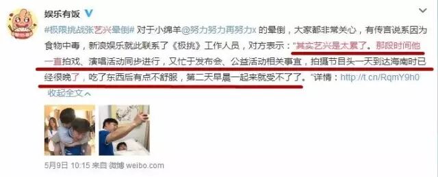 当时有传张艺兴晕倒是因为食物中毒,但后来有媒体联系了节目组工作人员,对方表示:“其实艺兴是太累了,那段时间他一直拍戏、演唱活动同步进行,又忙于发布会,公益活动相关事宜,拍摄节目头一天到达海南时已经很晚了,吃了东西后有点不舒服,第二天早晨一起来就受不了了。”