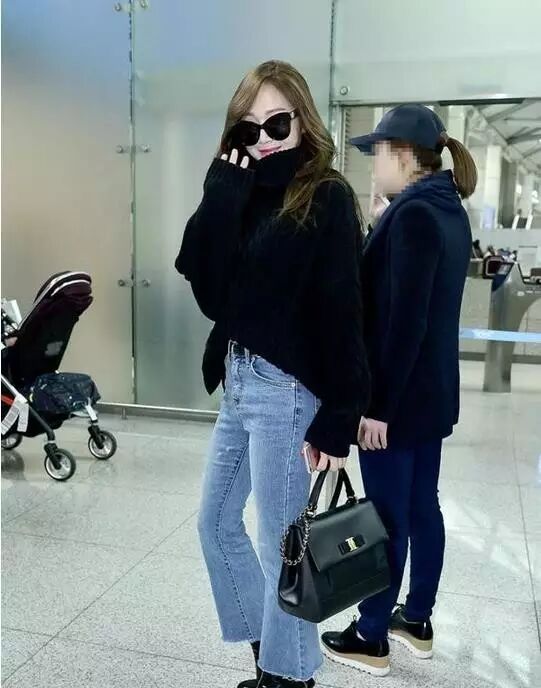 上宽下窄给人一种随性美,Jessica这身宽松的黑色毛衣搭配刷白牛仔裤、短靴,再搭配一个黑色包包,达到平衡搭配效果,看起来时尚又舒服。