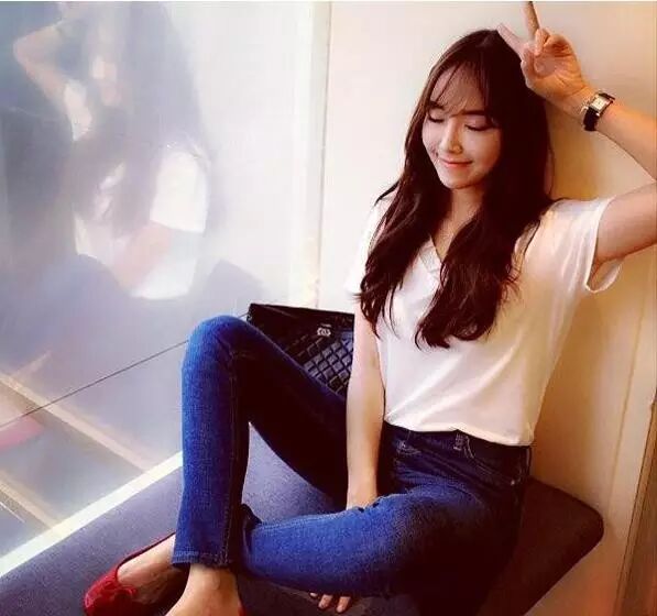Jessica偏好欧美简约风,一件白上衣搭配窄管牛仔裤,虽不华丽,但却不失时髦。