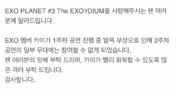 “喜欢EXO PLANET #3 The EXO'r DIUM的粉丝朋友们,现在有一个公告要告诉大家。EXO的成员KAI在第一周公演时因脚踝负伤, 所以在第二周的一部分舞台上不能够参与了。希望粉丝们可以谅解,KAI也会很快地恢复的。 希望大家给予鼓励, 谢谢大家!”