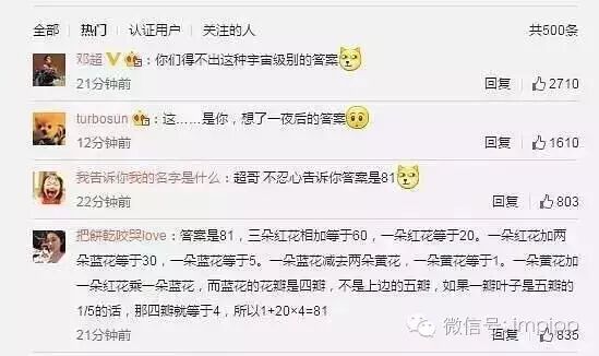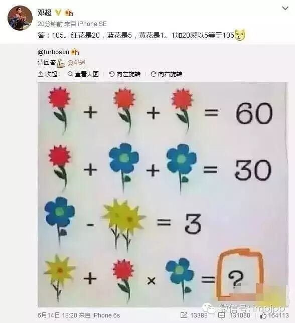 15日下午,邓超给出了答案,然而却是错的,遭到无情的“嘲笑”。邓超转发孙俪微博答道:“105。红花是20,蓝花是5,黄花是1。1加20乘以5等于105。”不料却被群嘲,孙俪评论称:“这……是你,想了一夜后的答案?”