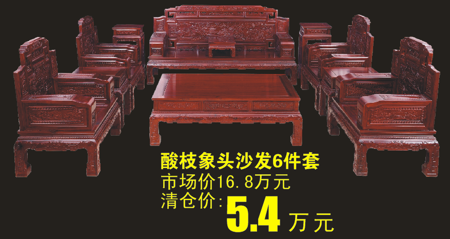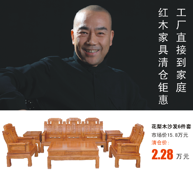据了解,在“红木直销惠”期间,所有的花梨木、红酸枝、金丝楠木、鸡翅木家具全部直接以出厂价销售,售价仅为专营店的1折左右,省钱90%购买真正的红木家具,现场看货,现场提货。
