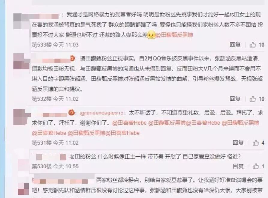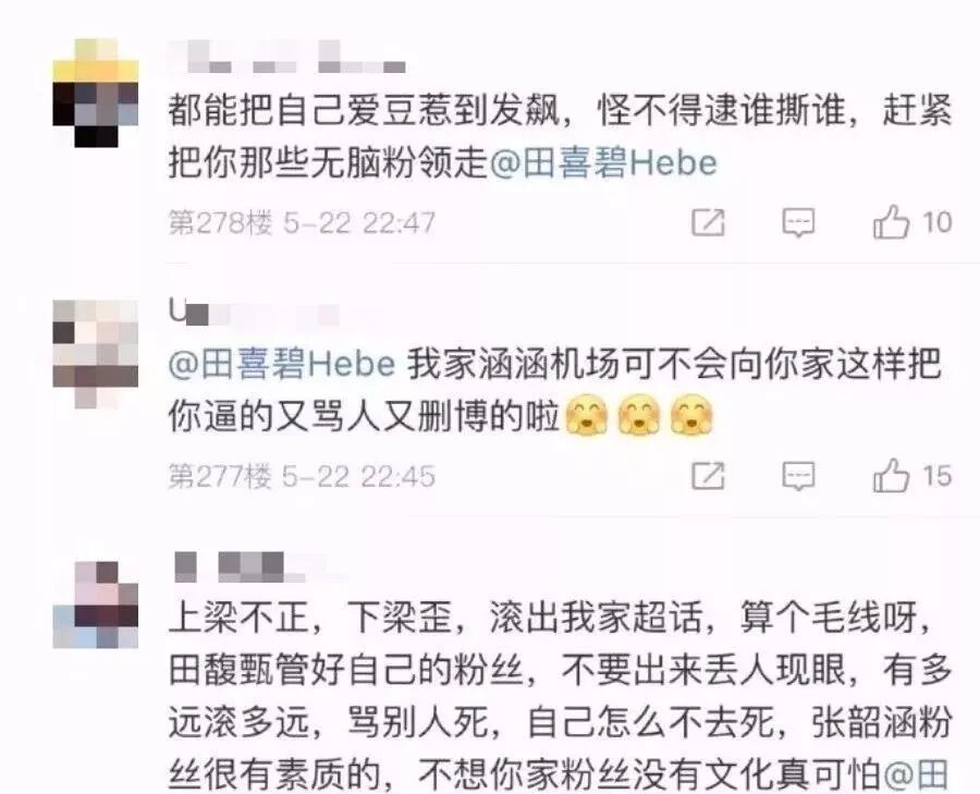 粉丝掐架哪家强?好像大家的杀伤力都hin不错,张韶涵反黑站摆出田馥甄粉丝之前黑自家爱豆的证据,言语中有杀人不见血的,有话如刀割的,还有寸草不生的。