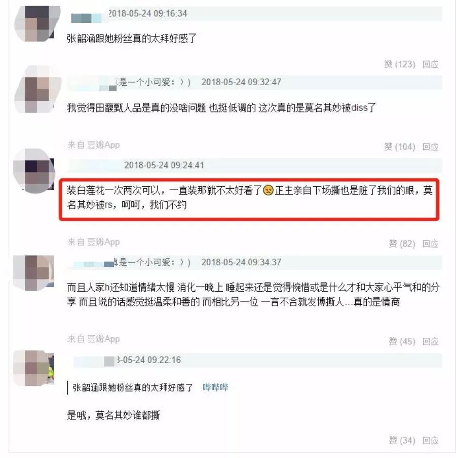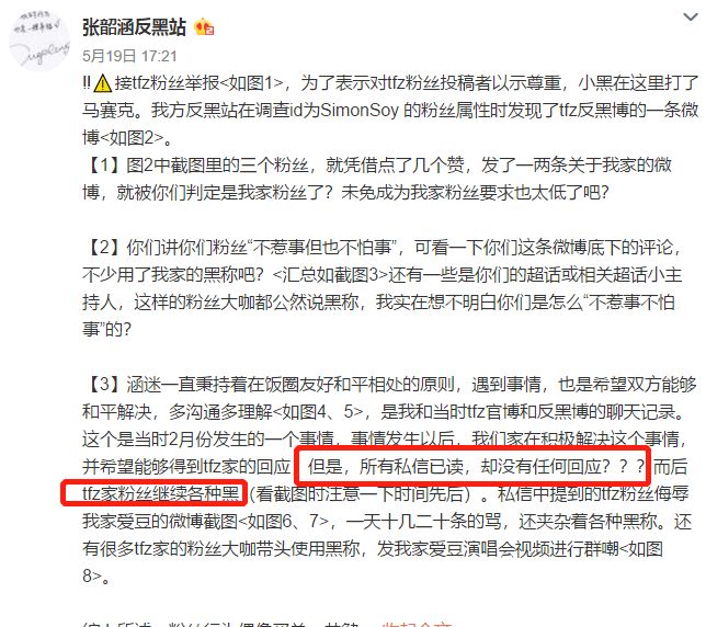 张韶涵反黑站因此也接到了田馥甄反黑博的私信,并回应澄清田馥甄反黑博指出的几位粉丝并不是张韶涵的粉丝。