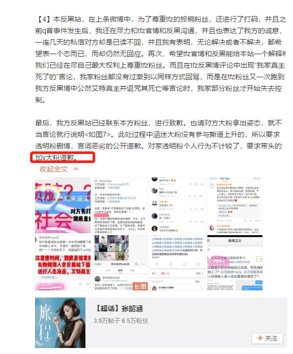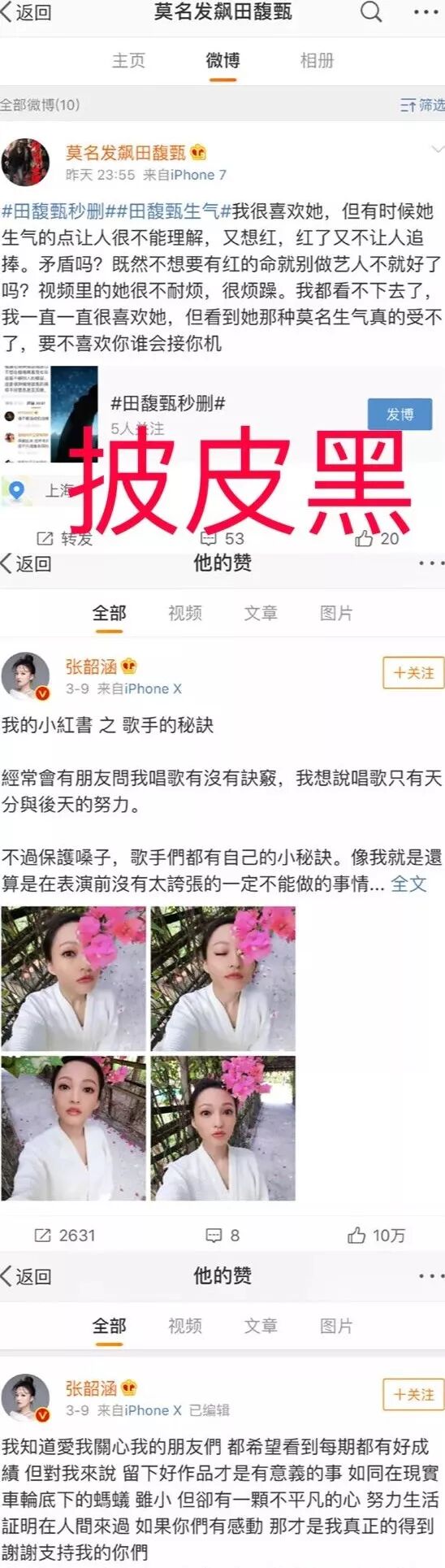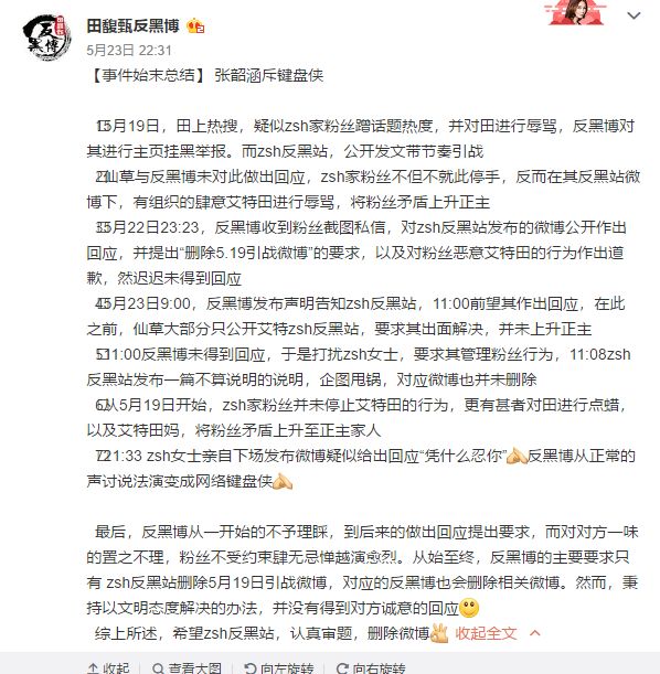 但同时张韶涵反黑站也没有善罢甘休,同样摆出田馥甄粉丝们在这段期间的不当言论,要求透明粉删微博,言辞恶劣者公开道歉。