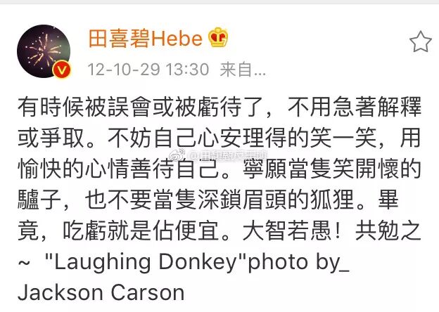 张韶涵的出手恰不恰当值得讨论,但一些网友已经拿出Hebe遇到相同状况的处理方式。很多人觉得Hebe佛系,她在面对网络暴力的时候,虽心有不满,但发表的文字还算平和。
