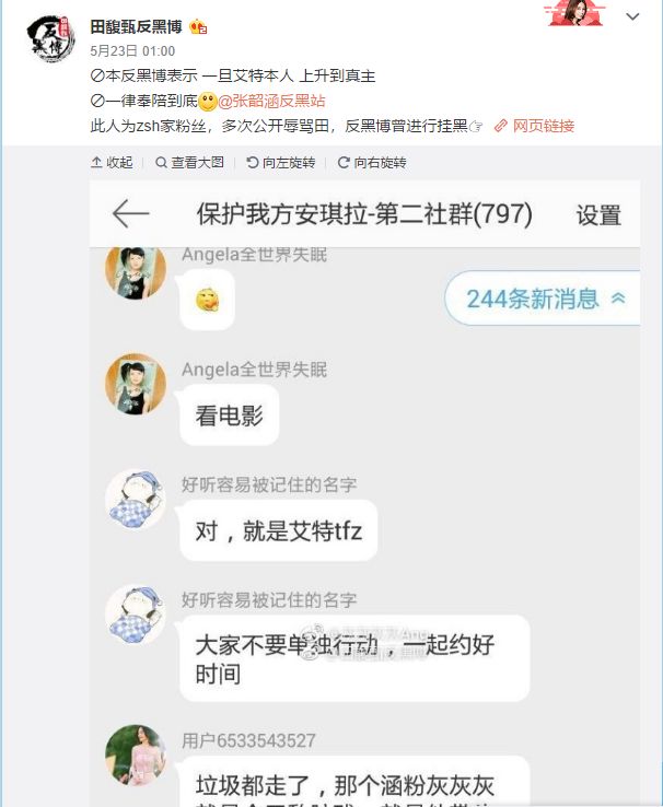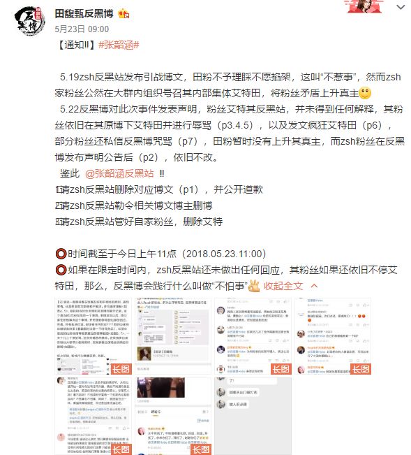 田馥甄反黑博面对来势汹汹的攻势,于5月23日9点带上话题#张韶涵#。并放出狠话:如果在限定时间内,zsh反黑站还未做出任何回应,其粉丝如果还依旧不停艾特田,那么,反黑博会践行什么叫做“不怕事”。