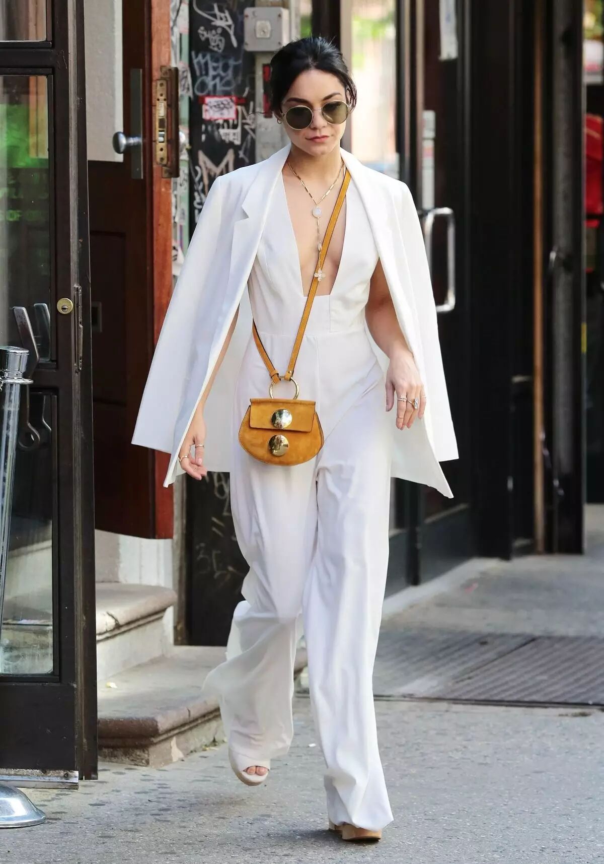 连身裤装很难驾驭,尤其是及地的阔腿连身裤。Vanessa依然选择大开领口款式和高水台高跟鞋,在一件全白色西装外套的协助下,轻松撑起这套女强人般装扮。显得高挑干练,气场全开。