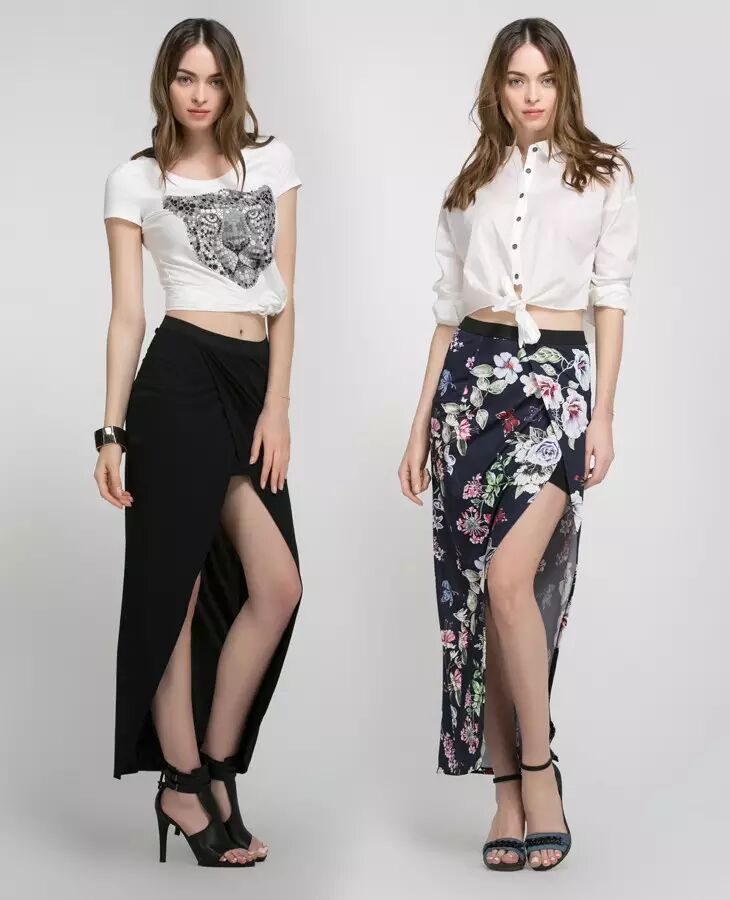 在这种搭配上,短上衣尽量选择纯色亮色,而下裙则选择与上衣对比的花色会有更好的效果。