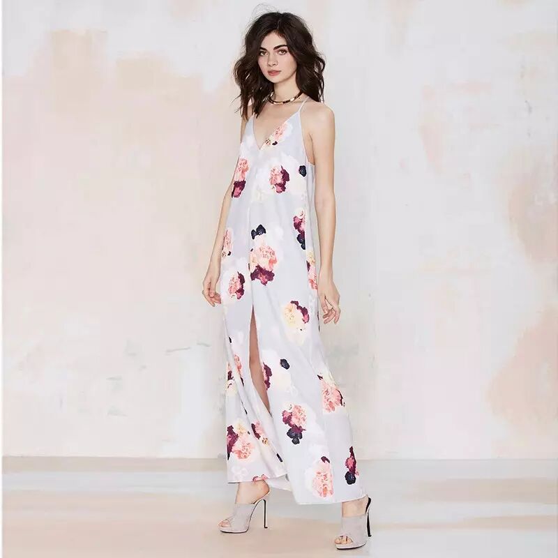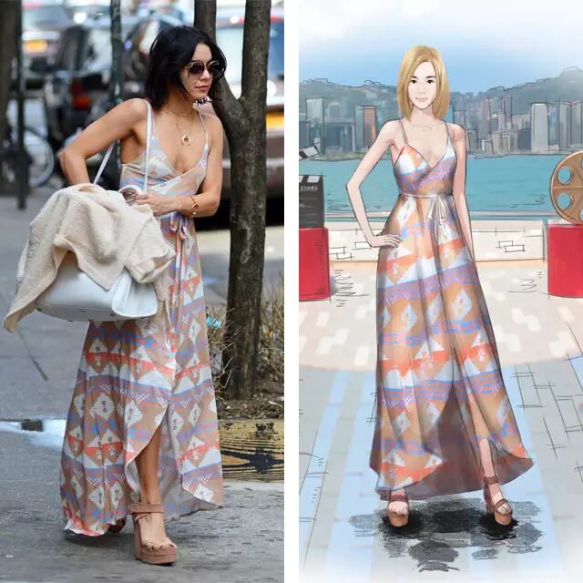 Vanessa选择了这种大开领口、高开叉的吊带连衣裙搭配水台高跟凉鞋显得整个人都高挑纤细了不少。其实也可以再搭配一件宽沿草帽,效果更加迷人。
