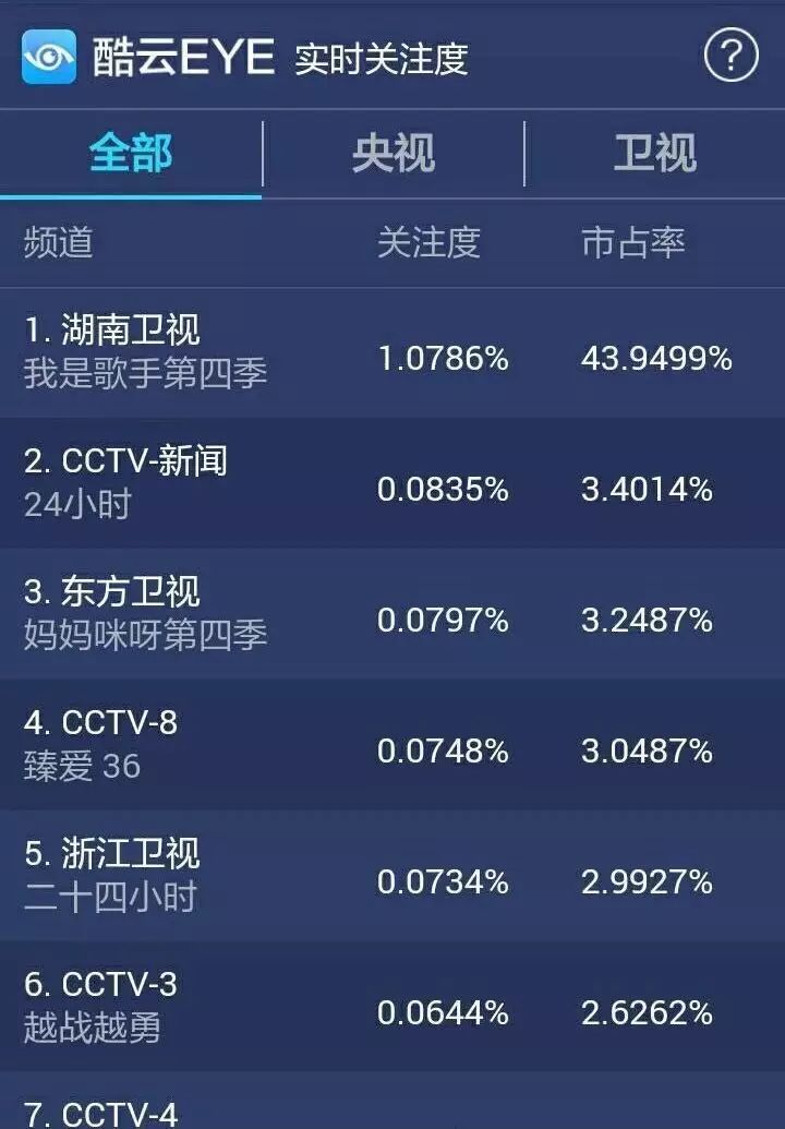 无论是决赛歌手的实力和知名度,还是火拼环节的娱乐性,与观众亲密互动的环节,加上湖南卫视强大的制作实力和平台传播优势,《我是歌手》第四季总决赛已经达到了无懈可击的水准。根据实时收视率显示,芒果TV、芒果直播同时在线人数1350万,市场份额超43%,在全国同时段节目收视排名中获得第一,将其他娱乐影视栏目甩出10条街。