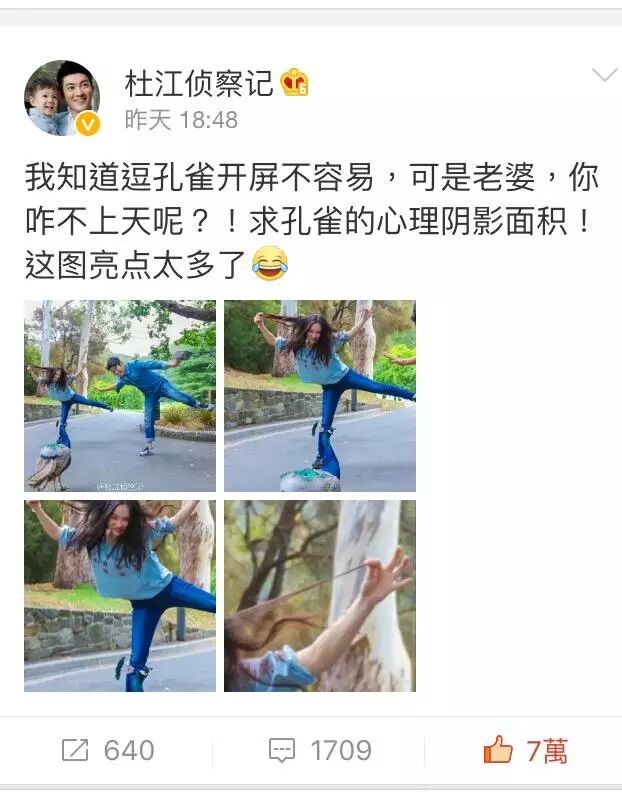 老婆的黑照哪能叫黑照?那是霍思燕竭尽全力逗孔雀,天真可爱的表现啊!杜江,你就准备跪搓衣板呗!
