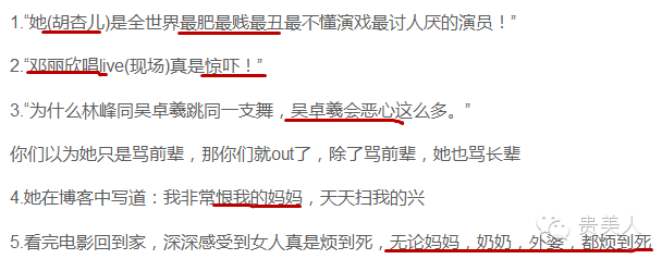 之前还各种大骂前辈,简直就是个小太妹形象↓比如骂胡杏儿又肥又贱(啊哦~伦家可不是有意爆粗口的~)而且居然对她的长辈也不积点儿口德,小伙伴儿们随意感受下邓紫棋的辣些“经典语录”↓