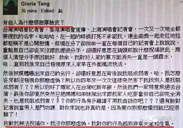 然而。。。真是说翻脸就翻脸啊。。。2014年俩人分手之后,邓紫棋却在脸书上炮轰林宥嘉N宗罪↓