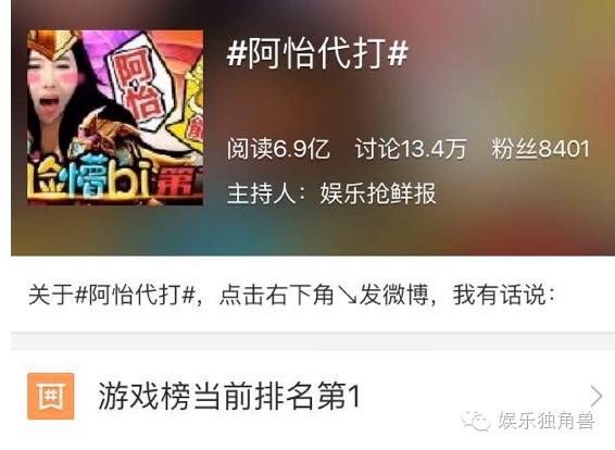 #阿怡代打#话题瞬间登上微博热搜榜榜首,阅读量一度达到6.9亿人次,在电竞圈引起轩然大波,目前在游戏话题榜排名第一。