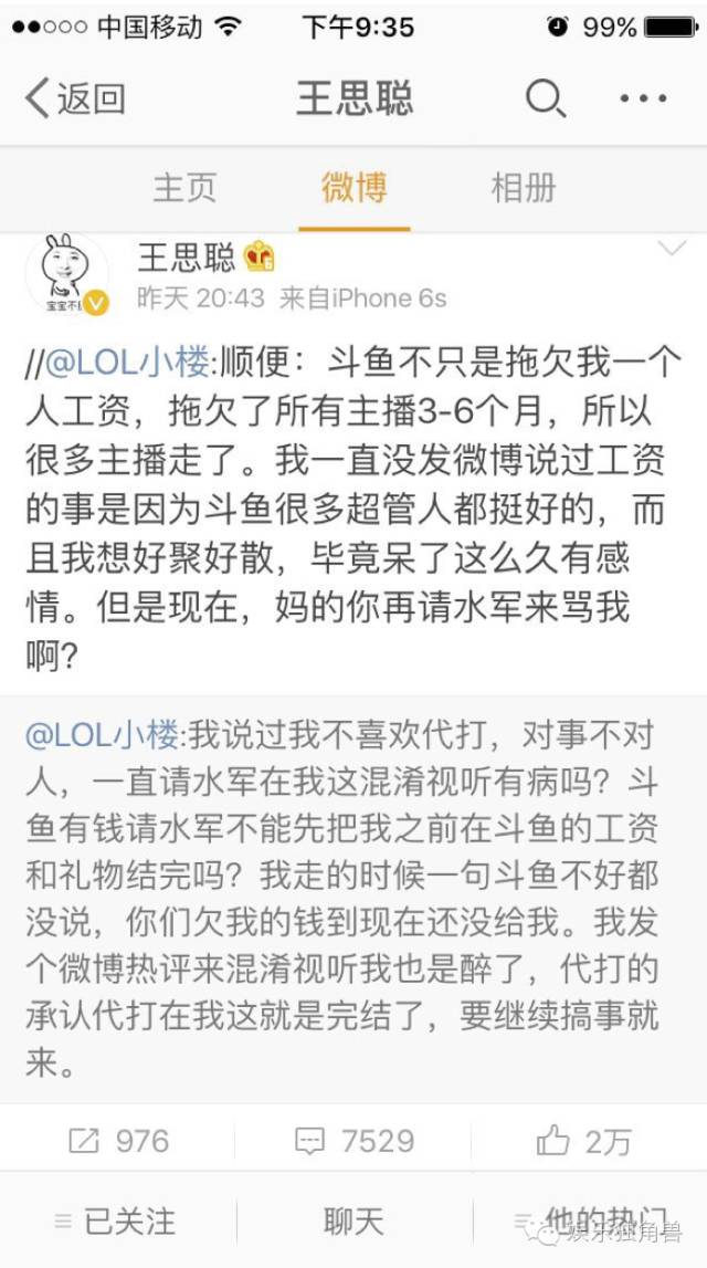 犯错方纷纷公开道歉,原以为代打事件就此划上句号,却不想6月9日晚,王思聪又转发了游戏主播lol小楼的一条微博,谴责斗鱼tv长期(3-6个月)拖欠工资,导致很多主播不得不出走。