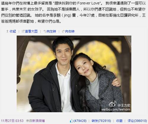 让这场绯闻发展到有一些戏剧化的时候是在2013年11月27号,王力宏忽然在微博宣布自己有女朋友,放出的照片中女友也是很有气质,十分甜美。