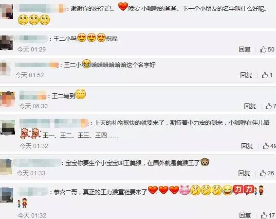 今年的2月份媒体就曝出李靓蕾再度怀孕的消息,后来经纪公司也是大方承认。昨天孩子出生之后阿美随意翻看了一下王力宏的微博评论,发现除了满满的祝福之外,也有一部分跑偏的网友开始给孩子起名。王二、王二小、王力猴等等都让人看的忍俊不禁。