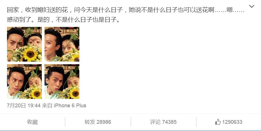 所以,一切的逗比、耍宝,其实都是源于深深的爱。他可以承受一切不开心,但一定要给老婆孩子最好的快乐。他们的恩爱,秀的高调又过的低调,可以是一束野花,也可以是半夜回家一杯热水和一只挤好牙膏的牙刷。