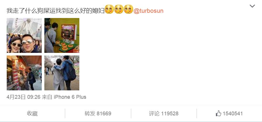 婚也结了,孩儿也生了,还一口气生了俩,一儿一女凑成一个“好”字。原本粉丝以为这个曾经的轻狂少年会就此一本正经的开始安稳的生活了,他却忽的一下在微博上逗出了一片新天地。