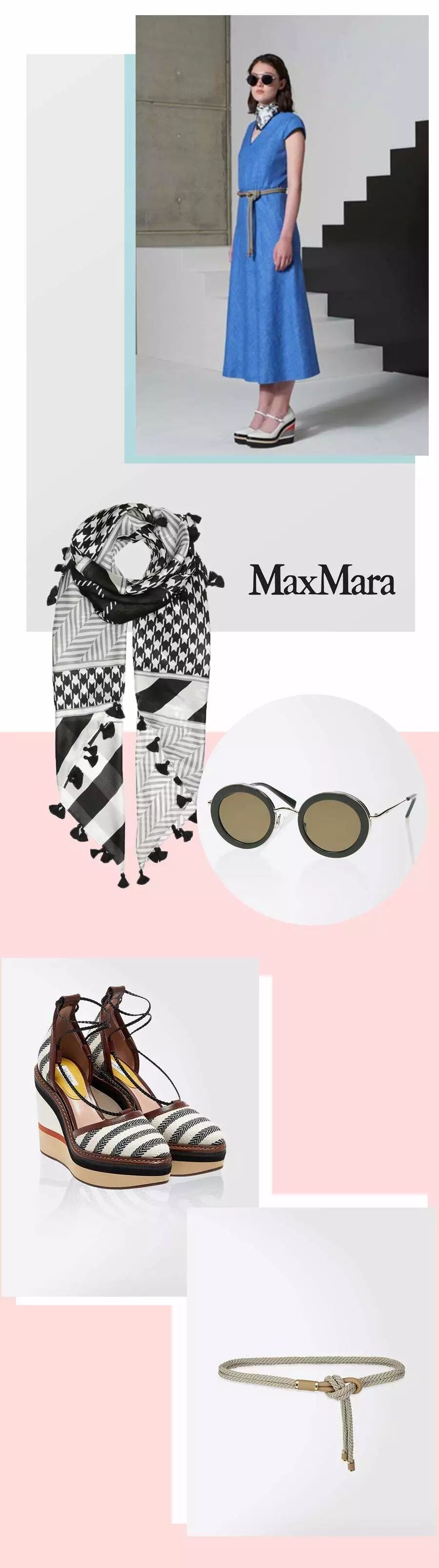 蓝色连衣裙加上黑白图案印花的丝巾,安静得不动声色,却又让人在注意到她时眼前一亮。