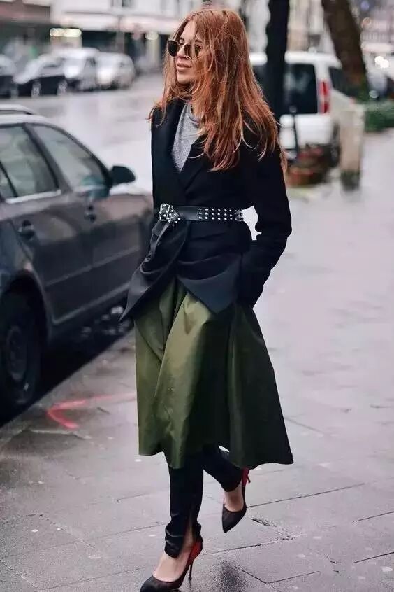 拿出夏天的半身裙,叠穿裤子意外的好看。黑色的紧身裤百搭没压力,搭配墨绿色的A字裙丝毫不突兀,还酷酷的。绑上一条腰带,制造高腰线的同时,也避免了上身过于臃肿的嫌疑,显高又显瘦。