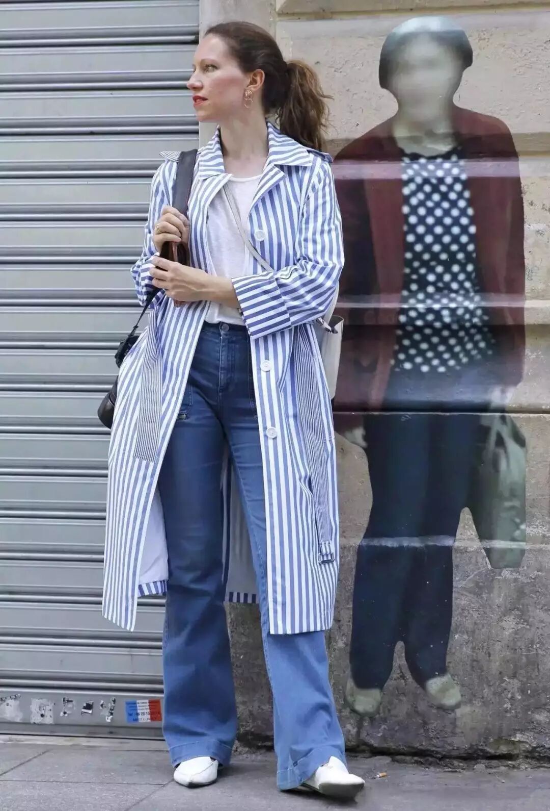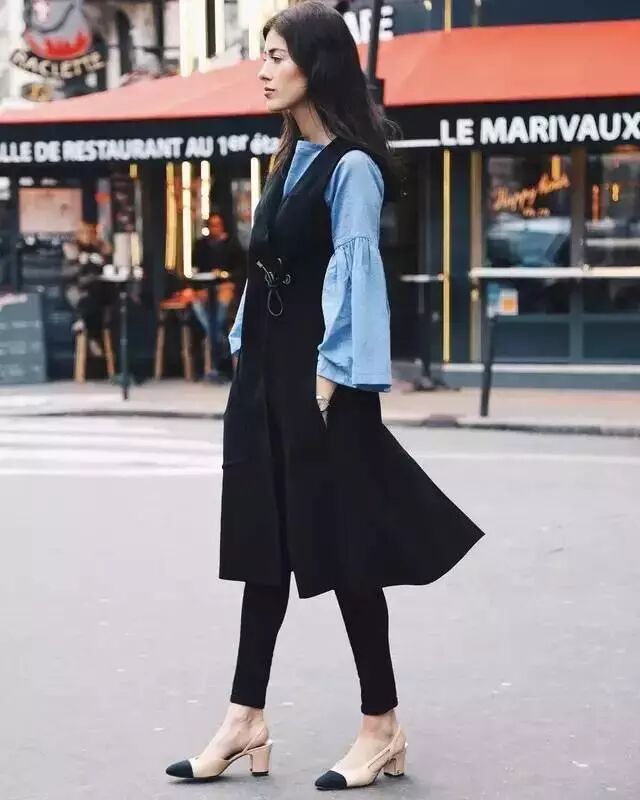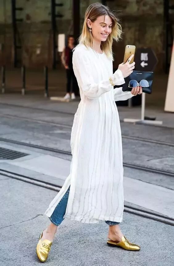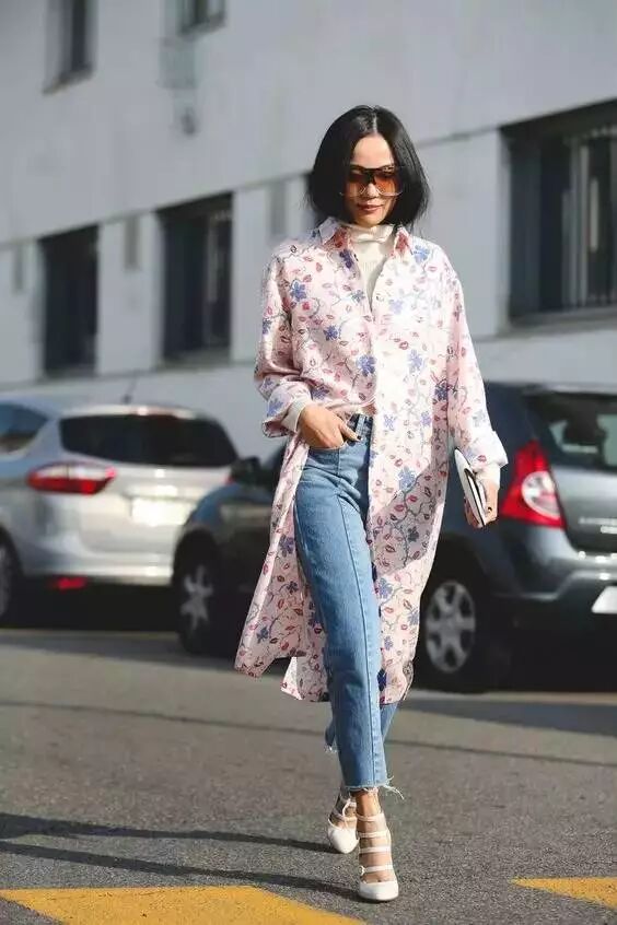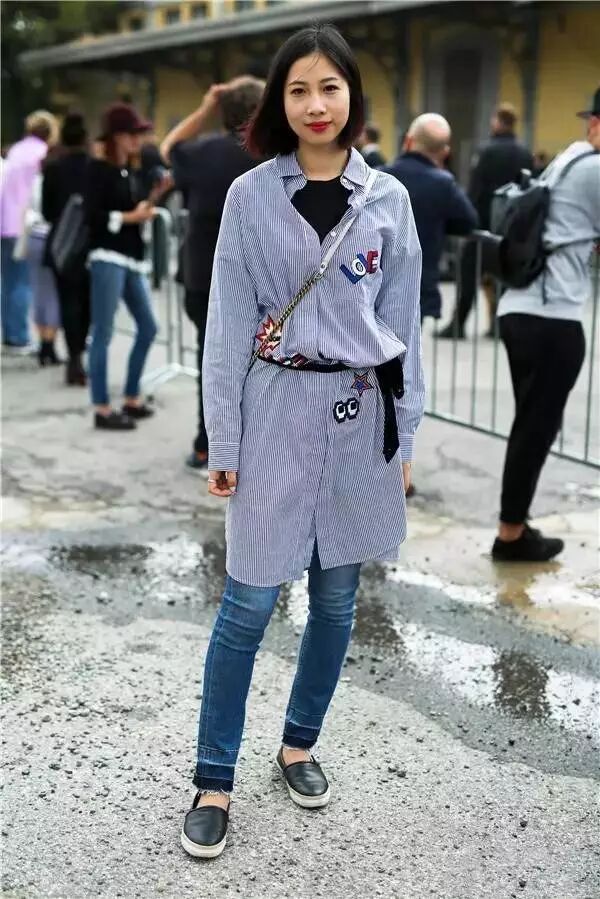 最简单的裙子搭裤子的方法就是选一条衬衫裙搭你的牛仔裤啦,像今年流行的蓝白竖条纹衬衫裙,就能穿得很清新。
