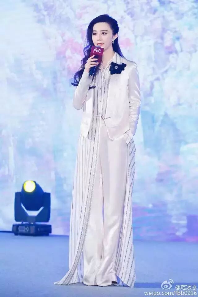 范爷一袭飘逸的衬衫裙,搭配西装外套+西裤,干练的气质下藏着浓浓的女人味,好是一番风情。