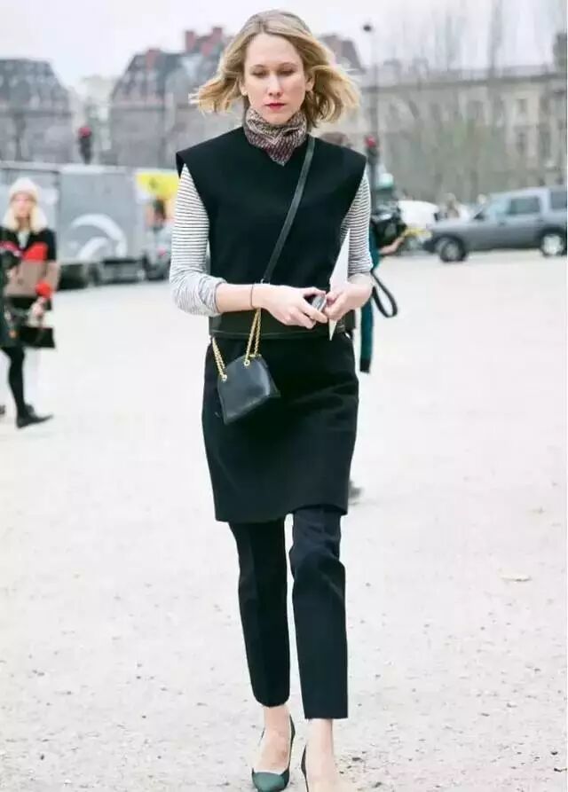 运用同色系搭配,显高不是问题。黑色A字裙搭配同色系小脚裤,简洁的同时多了一份独特感,显高的同时优雅又飘逸。