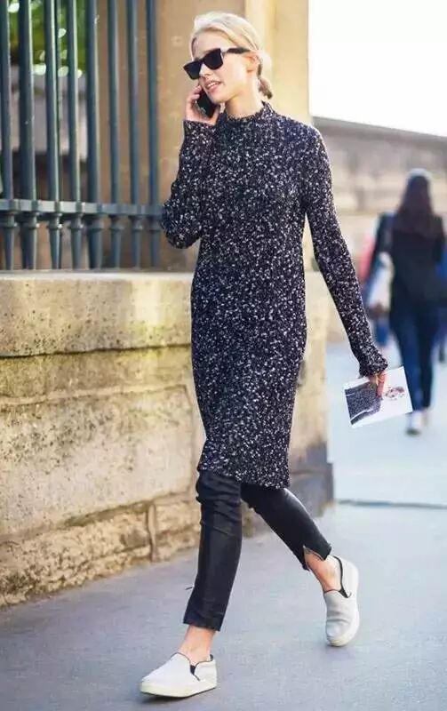 宽松的针织裙藏肉效果妥妥的,搭配牛仔裤随意休闲。而素色的针织裙,无论是牛仔裤、紧身裤,还是皮裤,都能hold住。搭配简单的一脚蹬,慵懒又时髦。