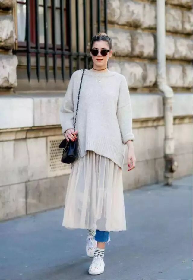 想要穿出青春气息?不妨试试雪纺裙+牛仔裤。搭配一件oversized毛衣,慵懒随性。如果担当穿出“孕妇装”的即视感,可以把毛衣换成修身款。