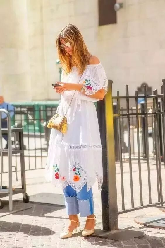 早已烂大街的露肩装,内搭一条牛仔裤,抢眼吸睛,还透着些许的小性感,为你赚足回头率~