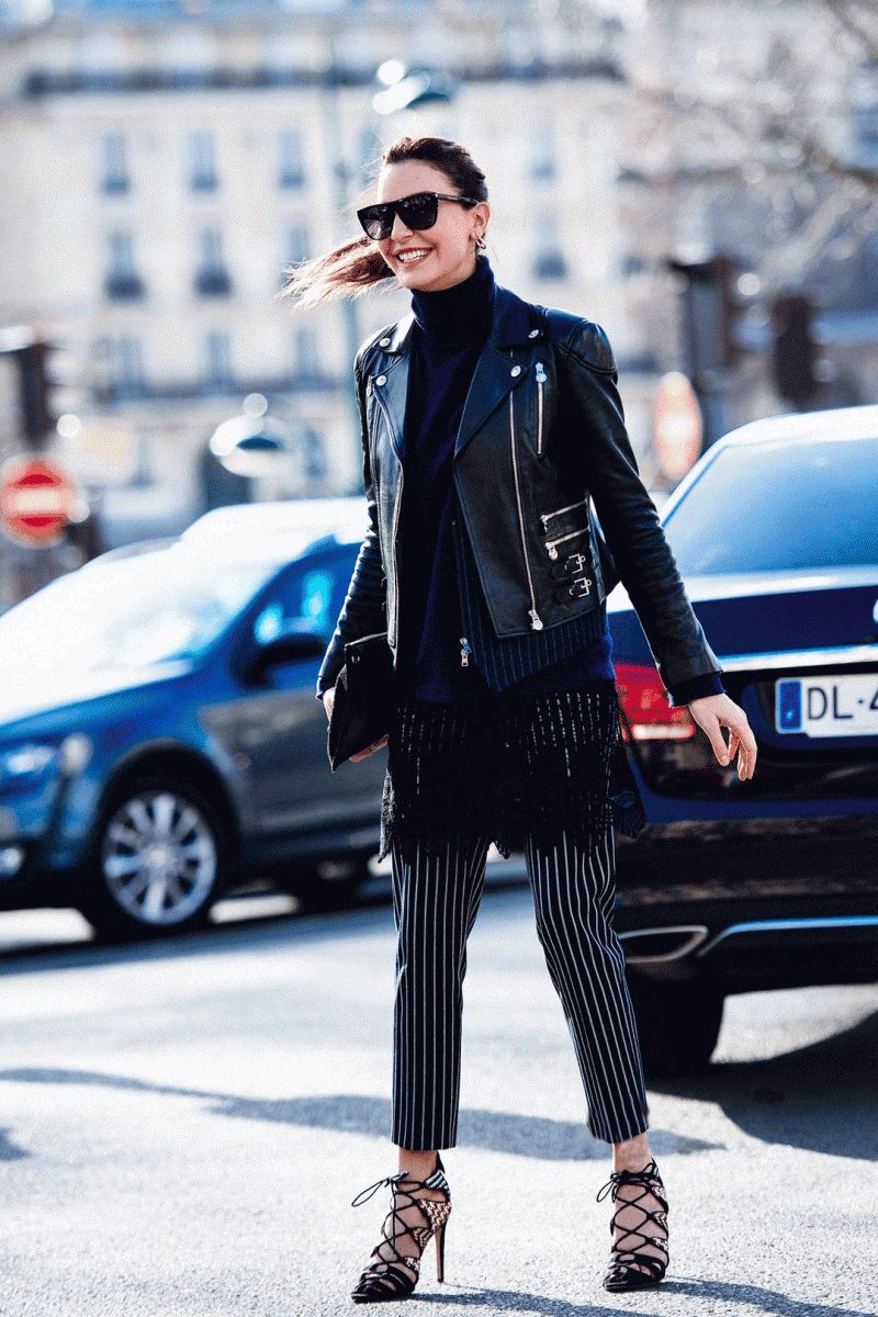 蕾丝裙+条纹西裤,弱化了西裤带来的干练感,加强了女人的柔和美,还多了几分少女气息~