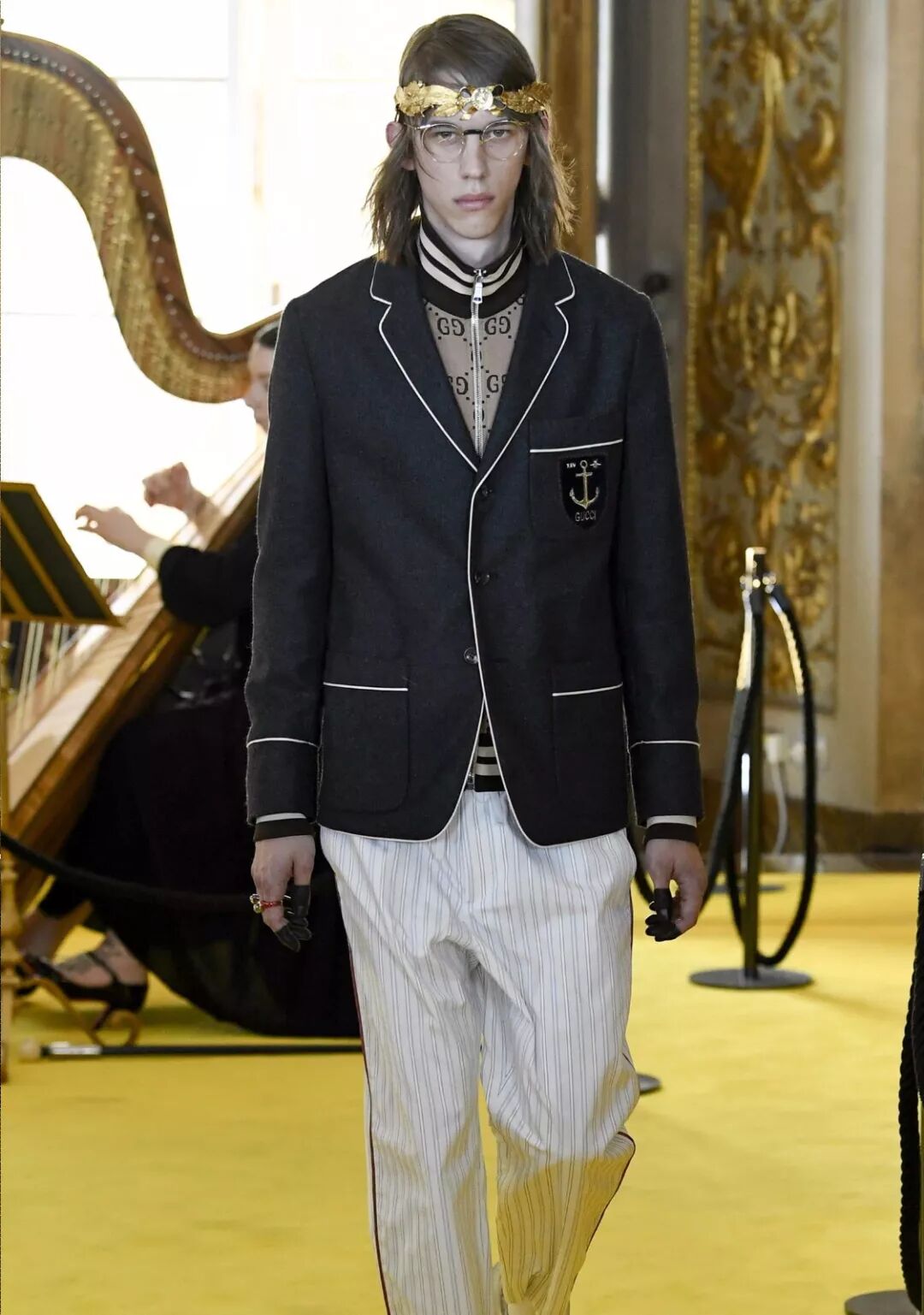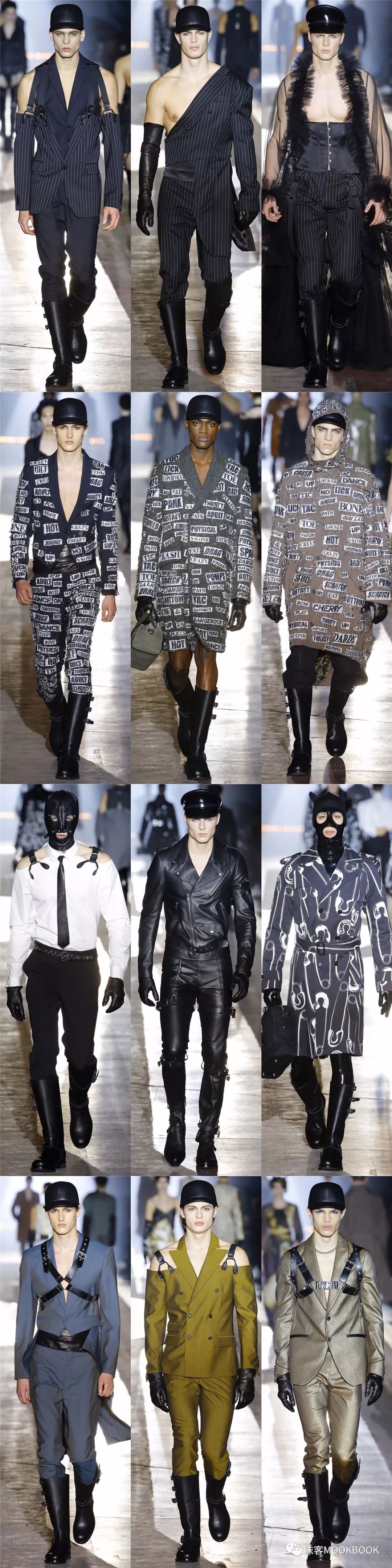 Moschino创意总监Jeremy Scott的搞怪兴致是没完没了的,他在2018秋冬男装系列中投入戏弄、测试和扭曲男女传统界限的手法,试图想重新评估、解放和刺激既有的穿著形式。Jeremy Scott表达,“对于这个系列,我想玩弄一个颠覆性的男性和女性混和的想法。所以一些明显的性别着装,像是细条纹印花西装可能是为女性设计,或让男士穿上花卉印花、蕾丝和丝绸设计的服装”。在混玩戏弄男女装的概念下,Moschino看似以庞克风和军装元素来贯穿设计,并有一系列满布文字图案的连帽风衣、外套和裤装,整个系列嘲弄讽刺的意味依旧浓厚,视觉冲击力十足。