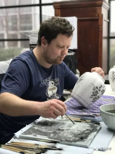 图为工匠正在上色,颜料看起来略微发黑。用不同浓度的颜料,烧制出来的瓷器颜色也深浅不同,因而形成有层次感的图案。就这样一个上色的工人,仅仅填料工艺就要学习7-8年的时间才能出师。