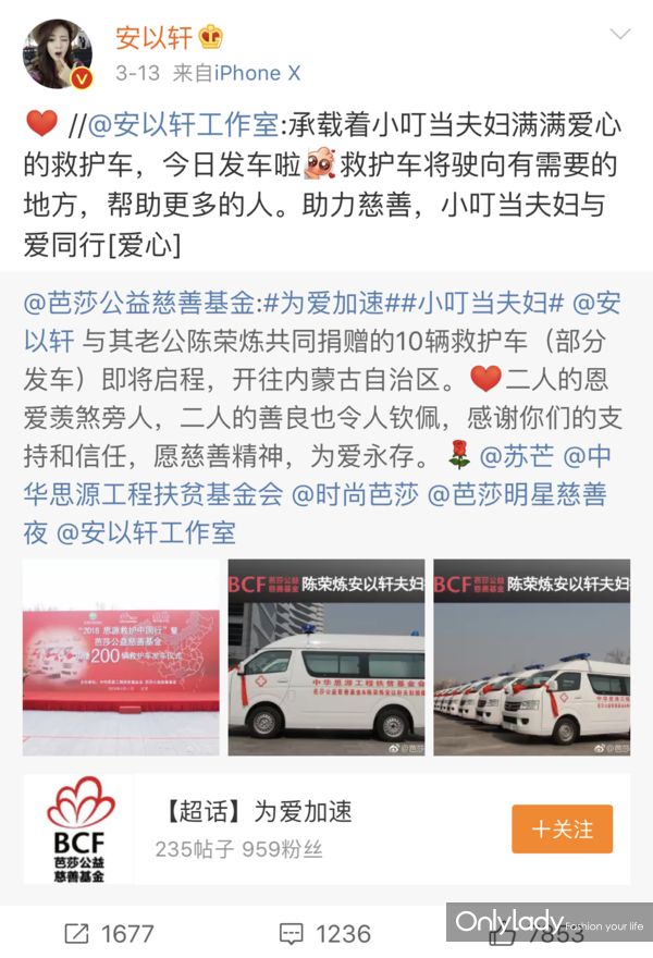 陈荣炼安以轩这对被昵称为小叮当夫妇的恋人为了慈善,更是一口气捐赠了十辆爱心救护车,希望这些救护车能帮助到需要帮助的人。