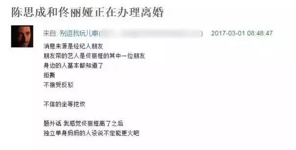 近日,有网友突然在网上爆料佟丽娅和陈思诚正在分割财产、办理离婚,曝料人称消息来源是经纪人朋友,“朋友带的艺人是佟丽娅的其中一位朋友,身边的人基本上都知道了,孩子归佟丽娅抚养。”