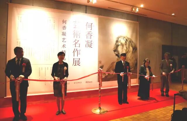 开幕式嘉宾剪彩,左起:公益社团法人日中友好协会会长代理宇都宫德一郎先生、何香凝美术馆副馆长乐正维女士、日本女子美术大学名誉理事长大村智先生、日本女子美术大学原校长佐野缝女士、日本女子美术大学校长横山胜树先生