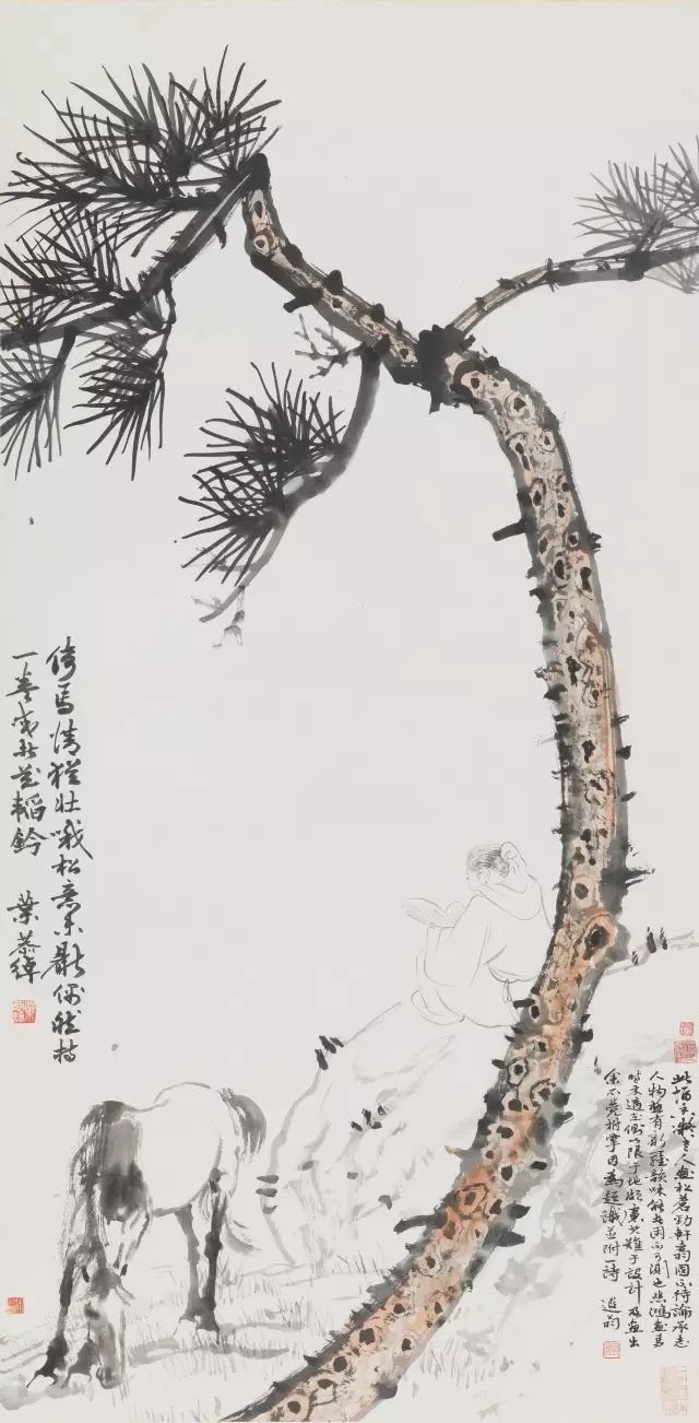 何香凝 廖承志 徐悲鸿《倚松读书图》,设色纸本,131.5×64cm,1951年