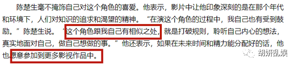 作为歌手之余,陈楚生也在演艺界有探索,2018他与章子怡、王力宏等主演了电影《无问西东》,在发布会上他表示很喜欢自己所饰演的角色,和他本身也有相似之处。他也表示非常愿意在有条件情况下多参加影视作品。