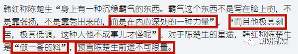 陈楚生的音乐实力不容小觑,韩红曾经公开力挺陈楚生,说他刻苦低调,内心深处拥有力量 ,是“做一哥的料”。